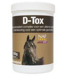 D-tox bevat een uniek complex van wetenschappelijk onderzochte, natuurlijke antioxidanten. Hiermee kunnen vrije radicalen veilig uit het lichaam worden gespoeld en wordt het natuurlijk evenwicht van het lichaam behouden. Hard werken en stressvolle periodes kunnen leiden tot een ophoping van vrije radicalen in het systeem van uw paard. De onderhoudsdosering kan bijzonder nuttig zijn voor de gezondheid van een (sport)paard. D-tox kan alleen worden gebruikt met specifieke NAF-producten die bij de individuele eisen van uw paard passen.