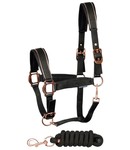 Luxe halsterset bekleed met rosegold glitter materiaal, fake fur onderlegd. Verstelbaar op twee plaatsen, aan beide kanten van het kopstuk en aan de kaak. De gaatjes zijn voorzien van ringen. Mooie rosegold finish buckles. Inclusief 2m touw.