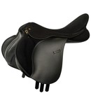 Synthetisch zadel met verwisselbare boom, licht in gewicht en eenvoudig in onderhoud. Het zadel is gemaakt van NOVA, een sterk kunststof leather-look materiaal met RIMA zitting voor een extra vaste zit. De kniewrong-steunen zijn ruim verstelbaar d.m.v. kl